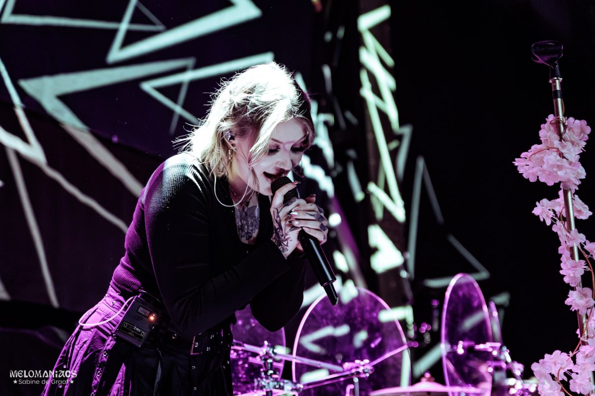 Doors to the venue opened a little after 18:00, and the fans slowly but surely trickled in to fill the room before the first act of the night would take to the stage at 19:00. As the intro started playing over the speakers, HIMITZU’s four members walked on stage: lead singer Marisa Weiß, bassist and synth player Amy Conley, guitarist Olcay Soydan, and drummer Louis Wippich. They opened their set with ‘LITTLE GIRL’ and ‘GASOLINE’, after which Weiß stated that she was unfortunately feeling ill tonight. Regardless, she took center stage during most of the songs, while also giving Conley and Soydan time to shine during some short solos. Weiß’s make-up was simply adorable, with a little heart painted in between her eyebrows, and together with the flowers all along the mic stands, the look and feel of the set were truly elevated. It was clear, however, that she was having a hard time fighting through her illness. While she sounded great, she got quite emotional as she told the audience how much she had been looking forward to tonight’s show. It had been a dream come true for the band to play here tonight, and for it not to be as perfect as planned was difficult. The crowd definitely felt the need to cheer her up, and they gave the band all their energy as they clapped during ‘HOLY WATER’ and jumped during ‘OVERDOZED’. HIMITZU ended their set tonight with their most political song, ‘HUM4N 3RROR’. Before ending on that banger, Weiß shouted something along the lines of “fuck nazis, fuck fascists”, which led to loud cheers from the audience.