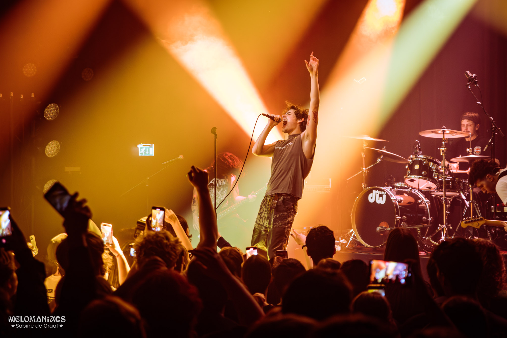 Doors to the venue opened at 19:00, and fans only had to wait thirty minutes before the first support act took to the stage. German singer h3nce (stage name of Henri Schamann) got the job to warm up the crowd for half an hour. Now 19, Schamann has been releasing music since he was just 15 years old, and just released his debut EP WRITE IT ON YOUR FLAGS. Together with him on stage was drummer Noah Anderson, and the two of them definitely got the venue heated. Several people in the audience were clearly familiar with Schamann’s music, and everyone who wasn’t yet still gave the singer all their energy. Schamann urged the audience to move, and especially, to mosh. “If you don’t move, you suck!” he said before playing ‘SUNLIGHT HITS YOUR FACE’. One fan had been asking him to take a video on his phone throughout the whole set, and six songs in, Schamann finally grabbed it from them, which led to enthusiastic cheers. Before Schamann ended the set with his two biggest songs, he asked the audience to move one more time, as this was the last show of his first-ever European tour. Everyone eagerly obliged as ‘VICTIM TO MY BRAIN’ and ‘GUN TO MY HEAD’ were performed.