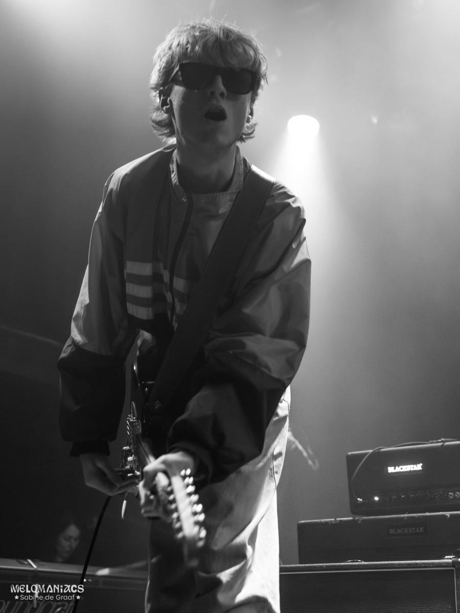 Thirty minutes after Garage Flower left the stage, it was time for STONE. As Madonna’s ‘Hung Up’ played over the speakers, the band members walked on one by one: lead singer and guitarist Fin Power, guitarist Elliot Gill, bassist Sarah Lucy Surrage, and drummer Alex Smith. They began the show with ‘MONKEY SEE MONKEY DO’, quickly followed by ‘STACK UP THE REASONS’ and ‘Rockmount’. The mosh pit opened up right away, and the first crowdsurfer made their way up onto the stage during the third song. “How are we doing, Amsterdam?” Power shouted out. “We’re going to have a party tonight. This room is fucking full, this is great!” The singer then asked the people if they were ready to dance to ‘Let’s Dance to the Real Thing’. Power himself was definitely ready and showed off some smooth dance moves.